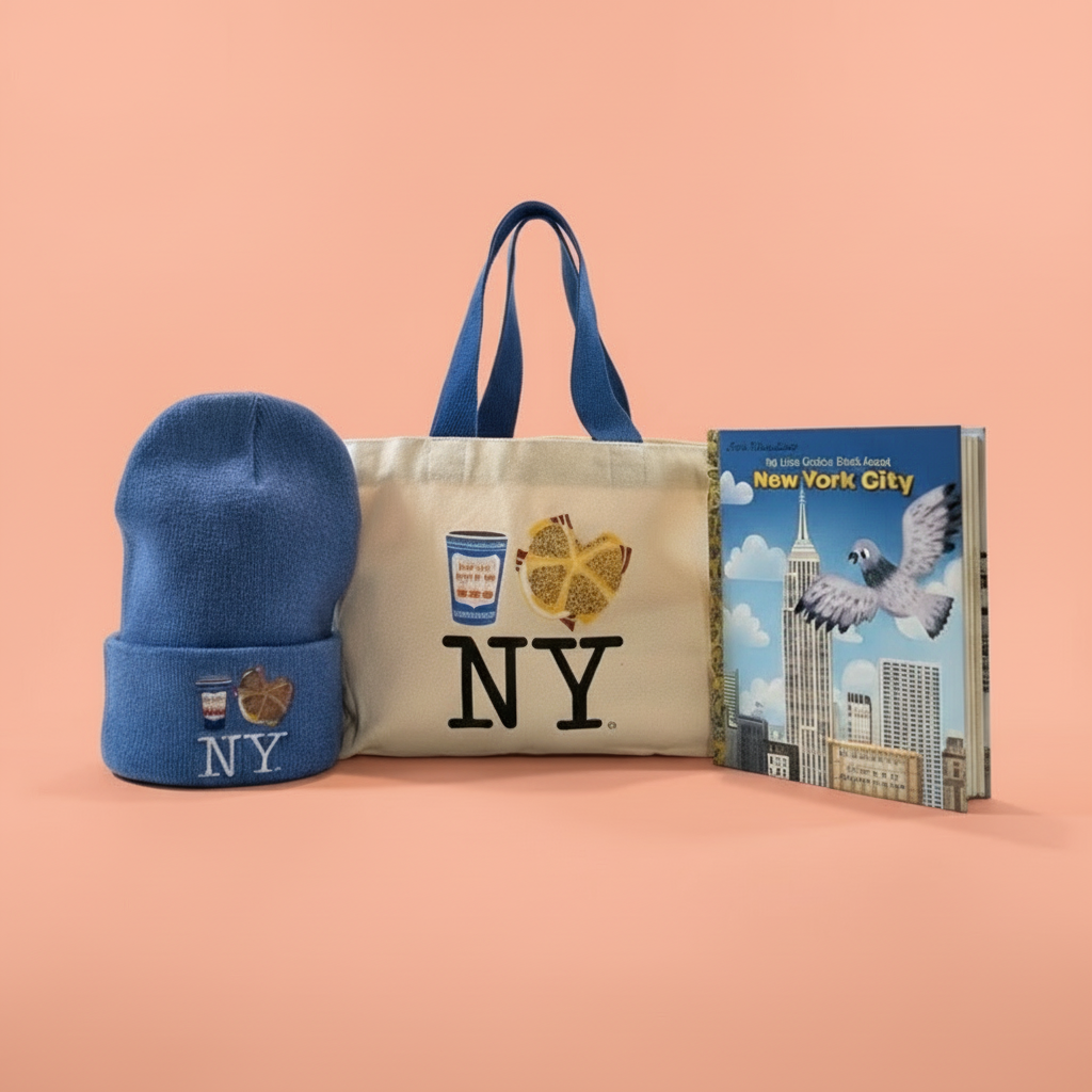 🗽 NY Tote Bag – A durable canvas mini tote with our signature “We ♥ NY” print featuring the classic coffee cup and pretzel combo. Perfect for little explorers on the go.